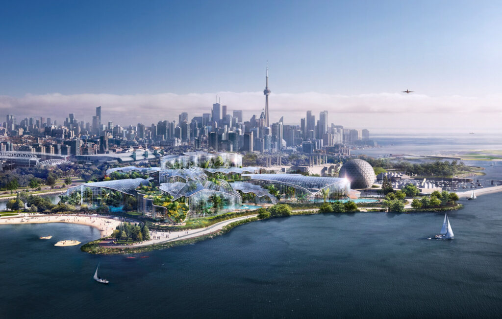 This project aims to transform Toronto’s waterfront with a wellbeing destination featuring indoor and outdoor pools, waterslides, botanical gardens, and relaxation areas. It is part of the revitalization of Ontario Place.
