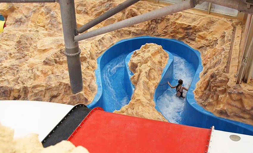 Beautifully themed cross between a slide and a wild water course. Guarantees a wild ride through a narrow rocky canyon.